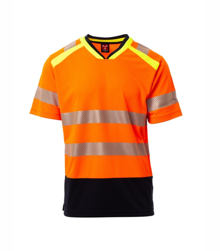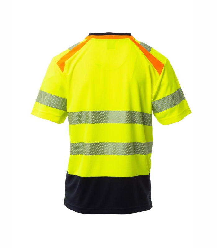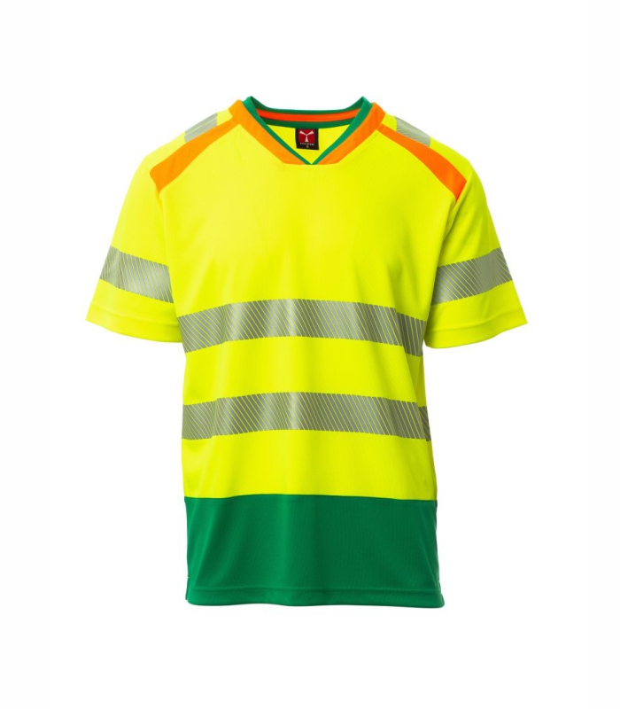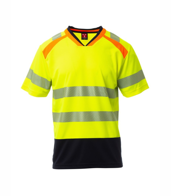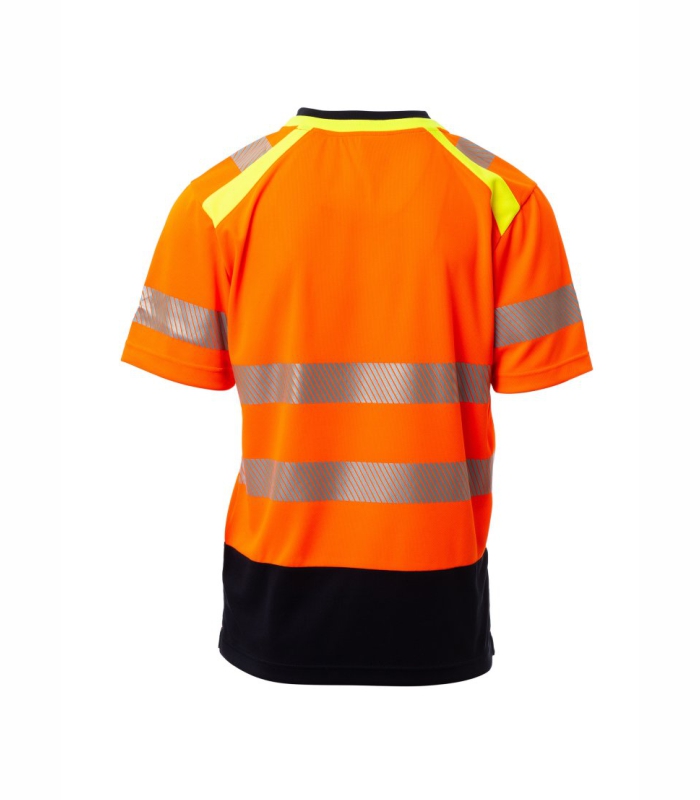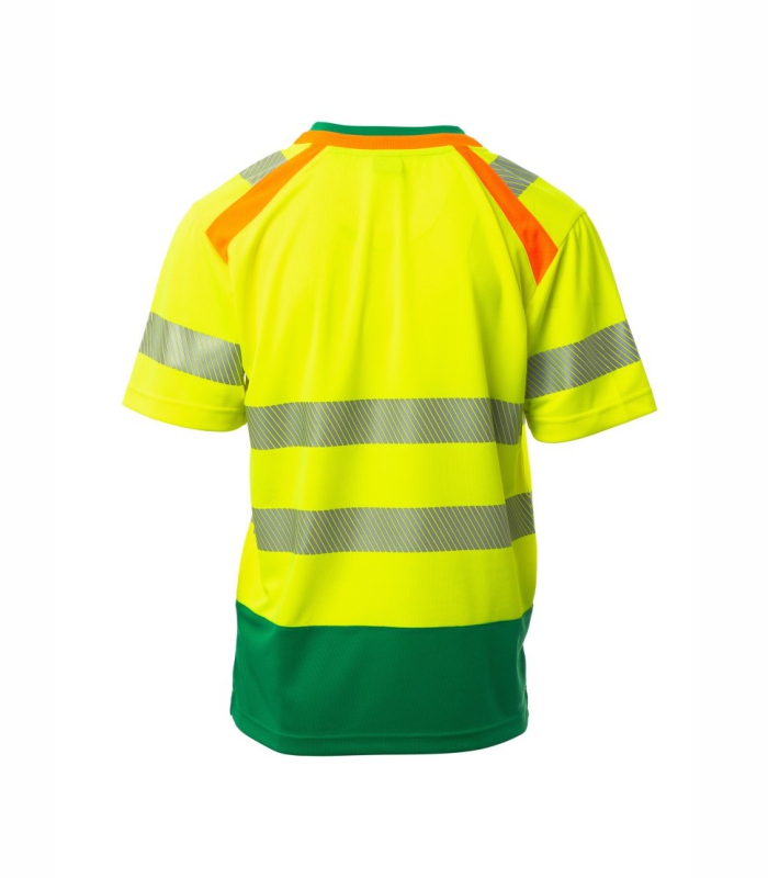 Dvobojna majica kratkih rukava visoke vidljivosti s V-izrezom. Kontrastni rebrasti ovratnik i pokriveni šavovi. Segmentirane i toplinski zavarene retroreflektirajuće trake na ramenima, rukavima i u struku za lakše kretanje. Kontrastna potporna traka. Bočni otvori.