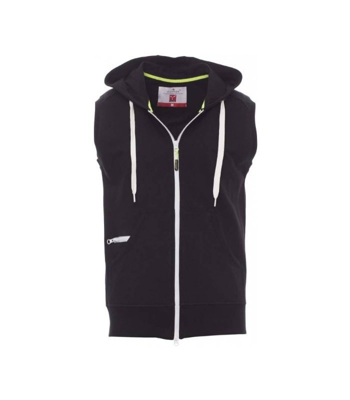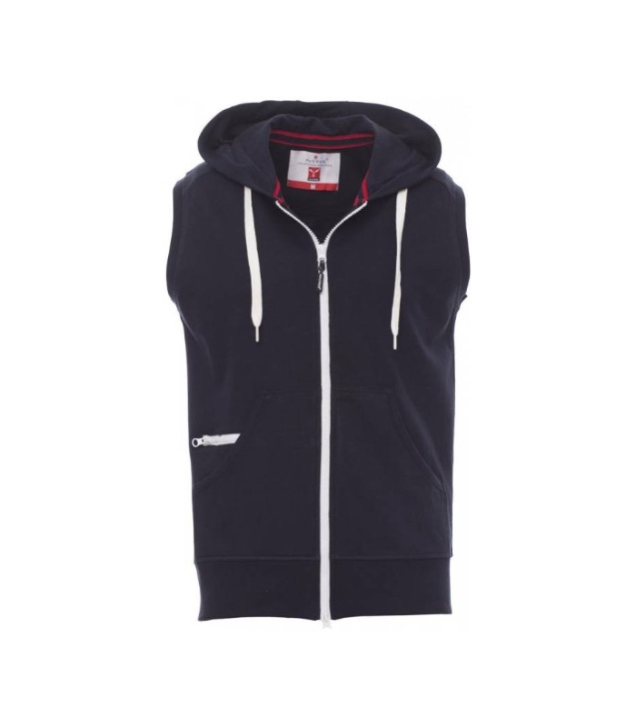 Muška majica s kapuljačom i bez rukava, plastičnim patentnim zatvaračem cijele dužine u kontrastnoj boji, s dvostrukim metalnim klizačem, formiranom kapuljačom i uzicama u kontrastu, klokan džepovima s malenim džepom s patentnim zatvaračem