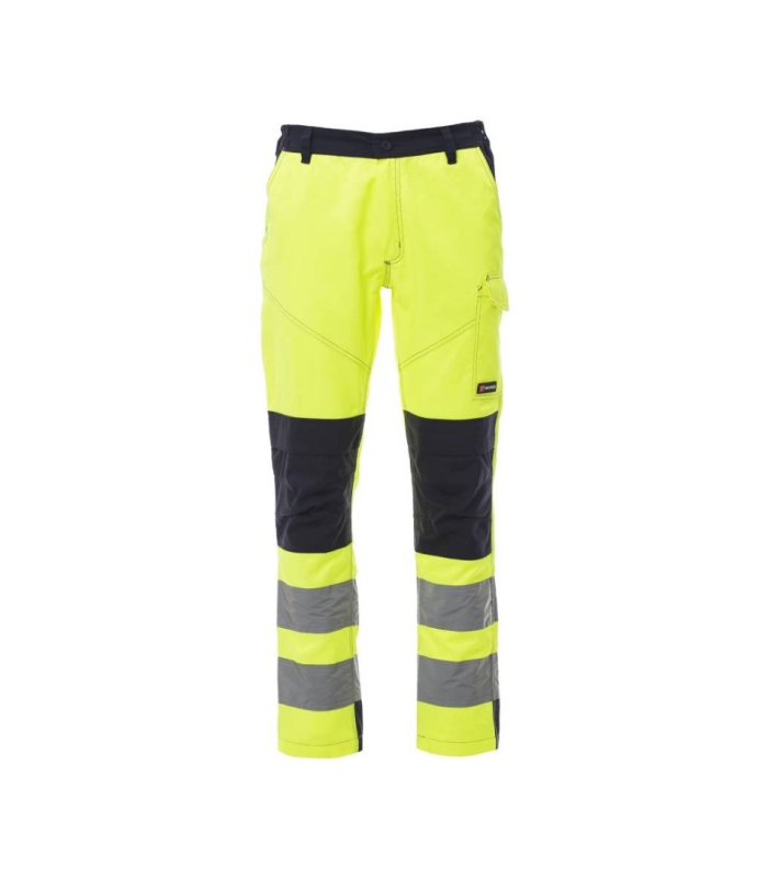Muške hlače za sva godišnja doba, visoke vidljivosti, s zaštitama za koljena i reflektirajućim trakama, bočnim elastičnim trakama i petljama za pojas oko struka, zatvaranjem patentnim zatvaračem s plastičnim gumbom, dvama klasičnim prednjim džepovima, bočnim džepom sa sustavom zatvaranja „LOCK SYSTEM”, držačem mjerne vrpce, držačem pametnog telefona, dva stražnja džepa, jedan otvoren s reflektirajućim trakama i jedan zatvoren s preklopom na čičak. Šavovi kontrastne boje, trostruki šav na unutrašnjem dijelu noge.