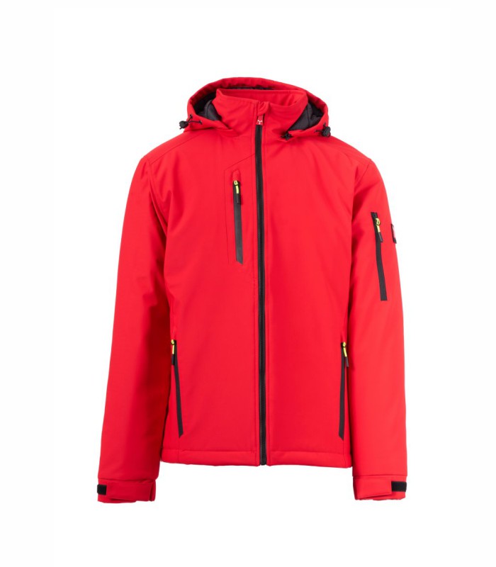 WP 8000 mm H₂O, WVT 5000 g/m² 24 h. Troslojna jakna izrađena od materijala Soft-shell, sa srednjom podstavom (140 g/m²), za muškarce, zatvaranje patentnim zatvaračem SBS s metalnim klizačem sa značajkom poluautomatskog zatvaranja i personaliziranim izvlakačem. Uklonjiva kapuljača s prilagodljivom uzicom za stezanje. Retroreflektirajuće trake na leđima i stražnjoj strani kapuljače. Rastezljive elastične uzice na zapešćima koje se mogu prilagoditi trakom. Dva bočna džepa s patentnim zatvaračem i jedan džep na prsima s presvučenim patentnim zatvaračem i jedan džep na lijevoj ruci s ušivenim držačem za olovke, sa zatvaranjem pomoću patentnog zatvarača. Fluorescentni klizači. Unutarnji džep koji se zatvara čičkom. Prilagodljivo dno s personaliziranim graničnicima.