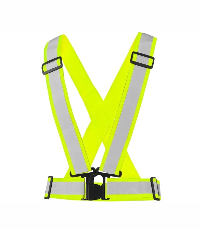 Elastični pojas u obliku križa s reflektirajućim trakama širine 3 cm.Uvlačive kopče omogućuju individualno podešavanje duljine i širine. Kopčanje u sredini plastičnom kopčom.