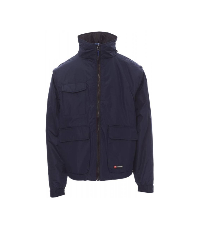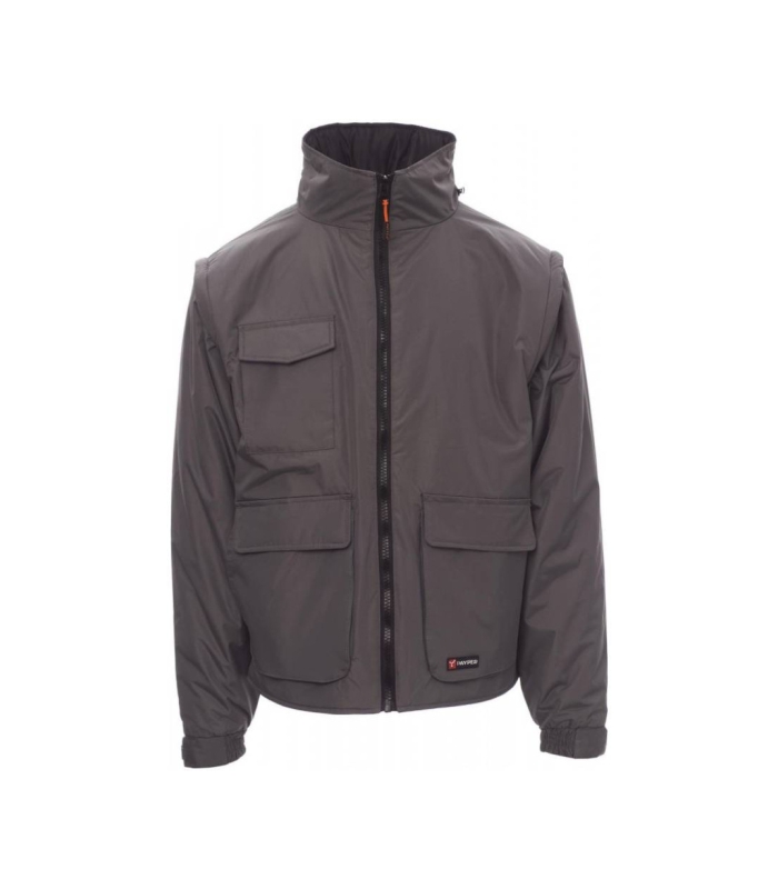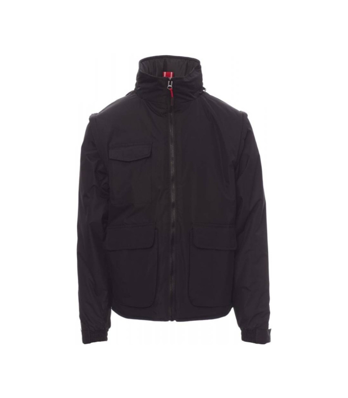 Muška jakna s odvojivim rukavima, plastičnim patentnim zatvaračem od 8 mm i metalnim klizačem, sklopivom kapuljačom u ovratniku, rastezljivim manžetnama, dva velika prednja džepa s patentiranim sustavom zatvaranja „LOCK SYSTEM”, dva bočna džepa, džepom na prsima za pametni telefon. Unutrašnjost: podstavljena, patentni zatvarač za lakše postavljanje otisnutih grafika i vezenog materijala.