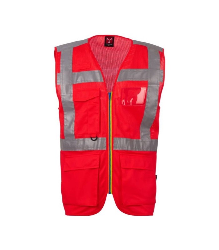 Prsluk visoke vidljivosti izrađen od prozračne mreže na gornjem dijelu i od tkanine dry-tech na donjem dijelu, s nekim kontrastnim modelima. Vodoravne retroreflektirajuće trake na ramenima, prsima i struku te dvije okomite retroreflektirajuće trake. Zatvaranje patentnim zatvaračem SBS s dvobojnom trakom. Višenamjenska petlja, džep s držačem olovke koji se zatvara trakom i prstenom na desnoj strani prsa. Dva vanjska džepa u stilu mijeha zatvorena trakom na gornjem dijelu i bočnim otvorom.
