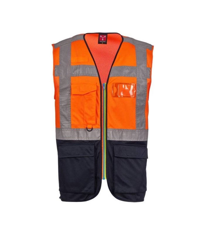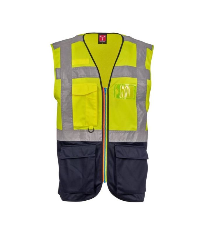 Prsluk visoke vidljivosti izrađen od tkanine dry-tech, donji dio u kontrastnoj boji, s vodoravnim retroreflektirajućim trakama na ramenima, prsima i struku te dvije okomite retroreflektirajuće trake. Zatvaranje patentnim zatvaračem s dvobojnom trakom. Držač značke zašiven na prsima s prednje lijeve strane. Višenamjenska petlja, džep s držačem olovke koji se zatvara trakom i prstenom na desnoj strani prsa. Dva vanjska džepa u stilu mijeha zatvorena trakom i bočnim otvorom na donjem dijelu.
