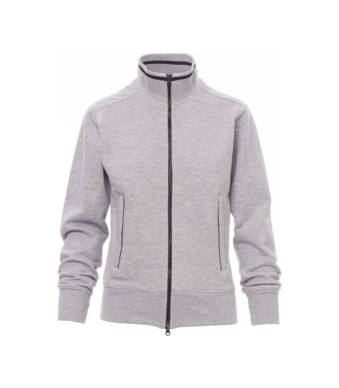 Strukirana ženska majica s plastičnim SBS patentnim zatvaračem pune dužine i kontrastnih boja s dvostrukim metalnim klizačem, s rebrastim ovratnikom, s kontrastnim obrubom na bočnim džepovima, s pripijenim rukavima, dva vanjska džepa s kontrastnim patentnim zatvaračem, rastezljivim rebrastim manžetnama i porubom te pojačanim šavovima.