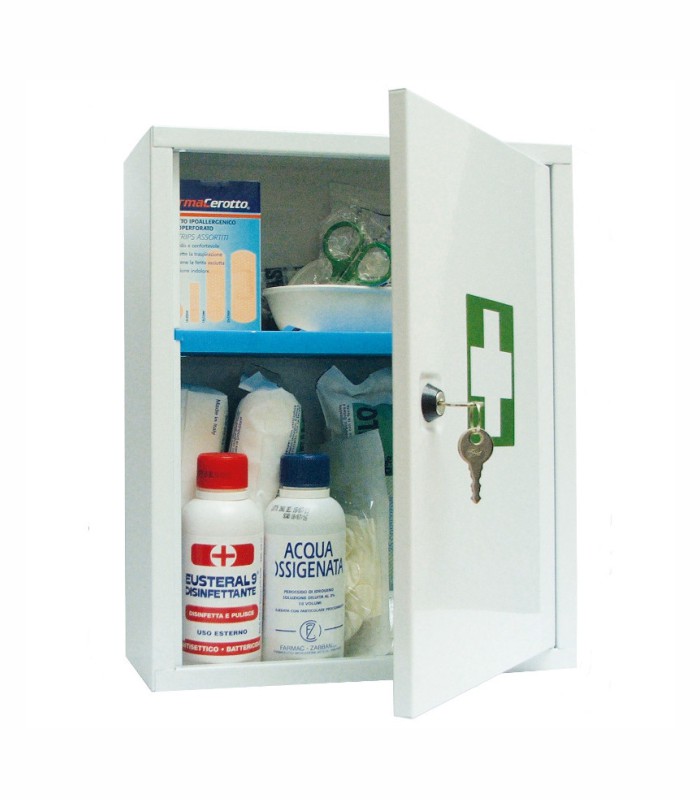 Metalni ormarić za prvu pomoć s prednje strane ima bravicu s ključem. Moguće ga je postaviti na zid (rupe na poleđini ormarića). Iznutra ormarić za prvu pomoć ima police na kojima je složeno 17 različitih artikala, od kojih su neki sadržani više puta. Metalni ormarić za prvu pomoć sadrži sve elemente prve pomoći koji su u hitnom slučaju potrebni. Dimenzije: 370 x 300 x 150mm