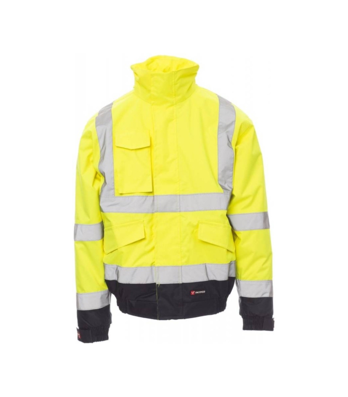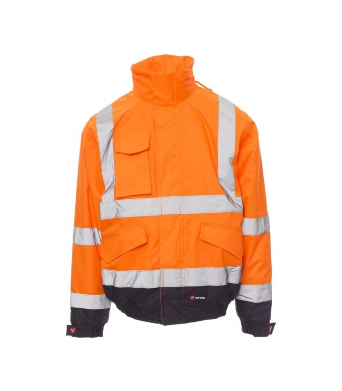 Dvobojna jakna visoke vidljivosti s reflektirajućim trakama i patentnim zatvaračem pune dužine s preklopom, kapuljačom koja se sprema u ovratnik, rastezljivom trakom oko donjeg poruba i manžetna, s dva velika prednja džepa s preklopom i čičkom, jednim džepom za mobilni telefon i prstenom za pričvršćivanje držača kartice s imenom, podstavljene unutrašnjosti sa džepom sa zatvaračem na čičak i toplinski obrađenim šavovima
