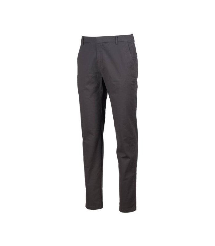 Chino hlače, od rastezljivog gabardina, suvremenog kroja, s krojenim omčama za remen, kopčanjem na patentni zatvarač, skrivenim kopčanjem s unutarnjom kukom i gumbom. Dva francuska džepa, jedan skriveni džepić na struku, dva stražnja džepa s dvostrukim rubovima i zaobljenim preklopom. Prorez u obliku lastinog repa na leđima. Zakovica u obliku propelera na desnom boku.