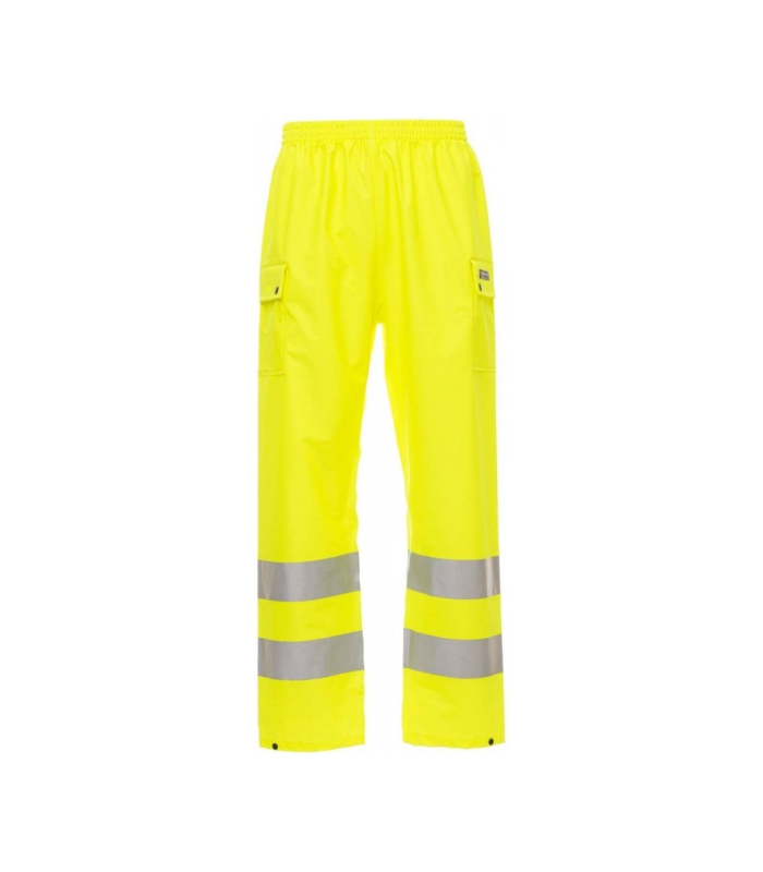 Hlače za zaštitu od kiše visoke vidljivosti s trakama 3M. Rastezljivi struk, dva bočna džepa s preklopom s otkrivenim pritisnim gumbima. Toplinski spojene trake i šavovi. Potpuno tkano od fluorescentne tkanine s dvjema reflektirajućim trakama koje omeđuju gornji dio obuće. Prilagodljiva nogavica s pritisnim gumbom.