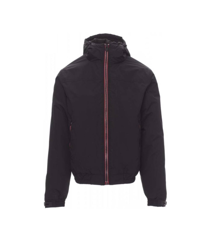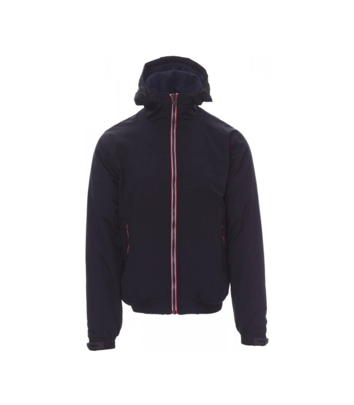 Muška obložena jakna s patentnim zatvaračem od 8 mm u kontrastu, oblikovanom kapuljačom s dva šava i uzicom, rastezljivom trakom oko poruba, elastičnim manžetnama i gumiranim trakama za prilagodbu, dva vanjska džepa s pokrivenim patentnim zatvaračem. Unutrašnjost s mikroflisom na ovratniku i leđima. Džep za pametni telefon sa zatvaračem i otvorom za kabel te patentni zatvarač na prsima i leđima za lakše postavljanje otisnutih grafika i vezenog materijala.