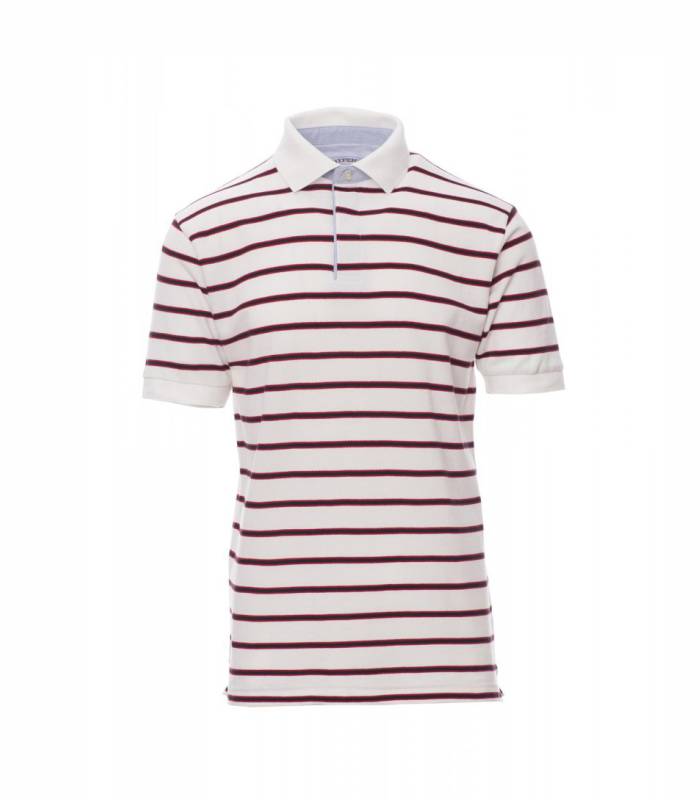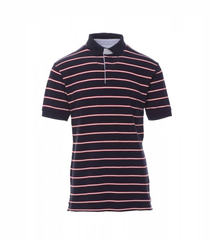 Polo majica kratkih rukava s tri bijela gumba, prugama, preklopom na gumbima, unutarnjim dijelom ovratnika i bočnim otvorima u Oxford plavoj boji, rebrastim ovratnikom i obrubom rukava.