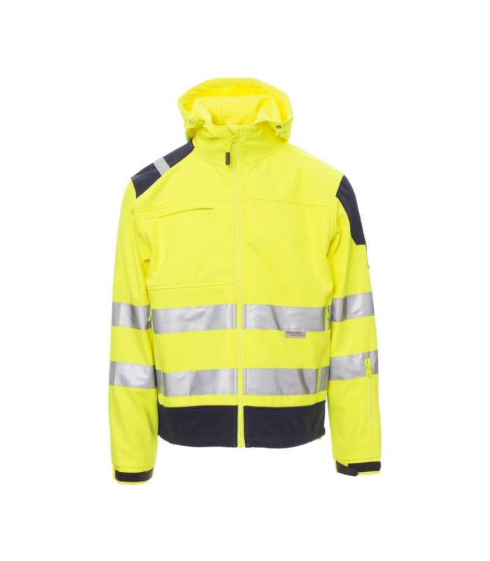 WP 8000 mm H₂O, WVT 5000 g/m² 24h. Ergonomski oblikovana dvobojna muška jakna s trakama 3M za visoku vidljivost, raglan rukavima, oblikovanom kapuljačom s dva šava i uzicom za stezanje, dugim patentnim zatvaračem SBS, prilagodljivim manžetnama sa čičkom, dva bočna džepa s patentnim zatvaračima, prsnim džepom, odvojivim/sklopivim držačem za značku i džepom na lijevom rukavu.