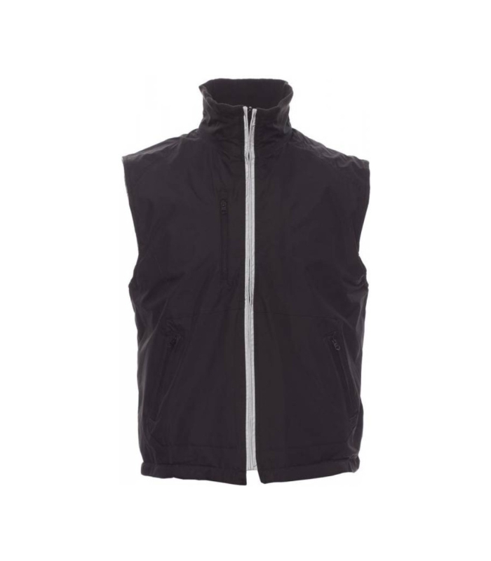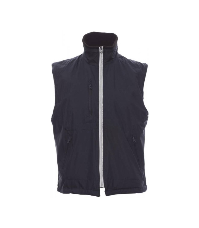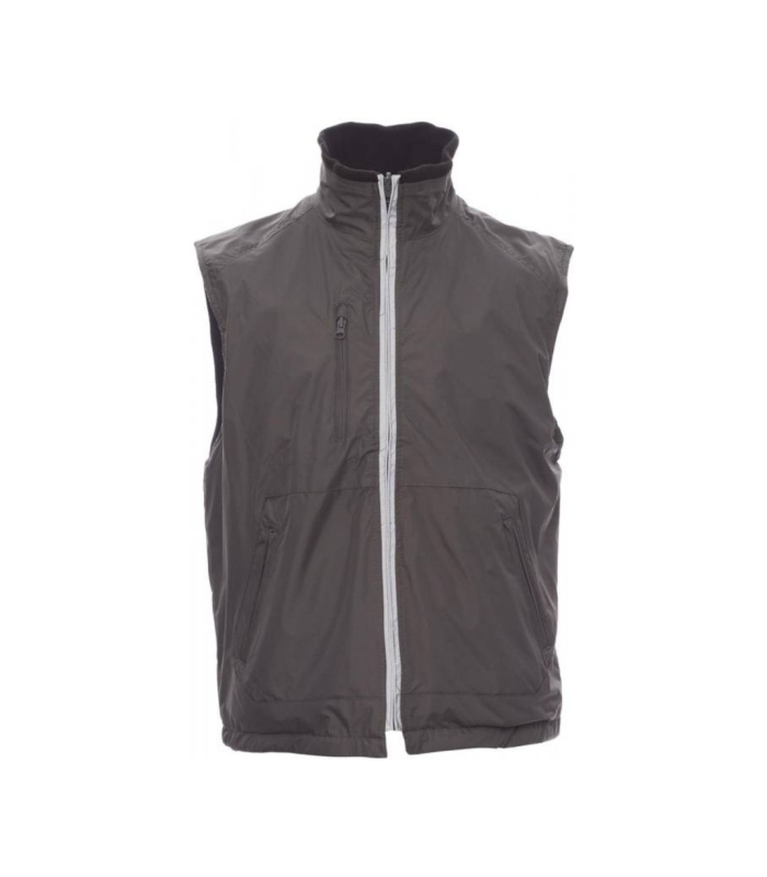 Dvostrani uniseks prsluk s plastičnim patentnim zatvaračem s reflektirajućim cjevastim porubom, uzicom za stezanje oko struka, tri vanjska džepa. Podstava od flisa, rebrasta pletena unutrašnjost ovratnika, dva prsna džepa s patentnim zatvaračima za jednostavniji tisak i tkanje.