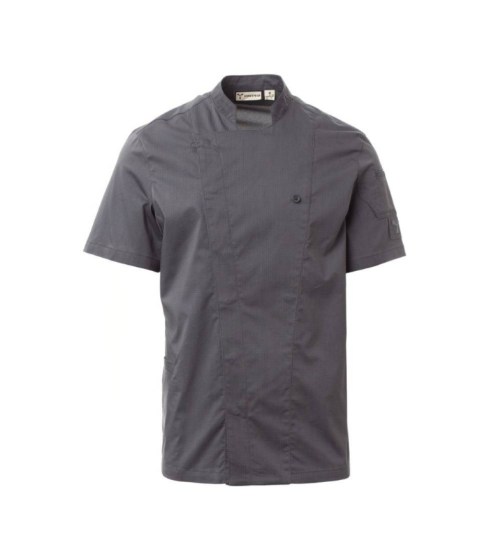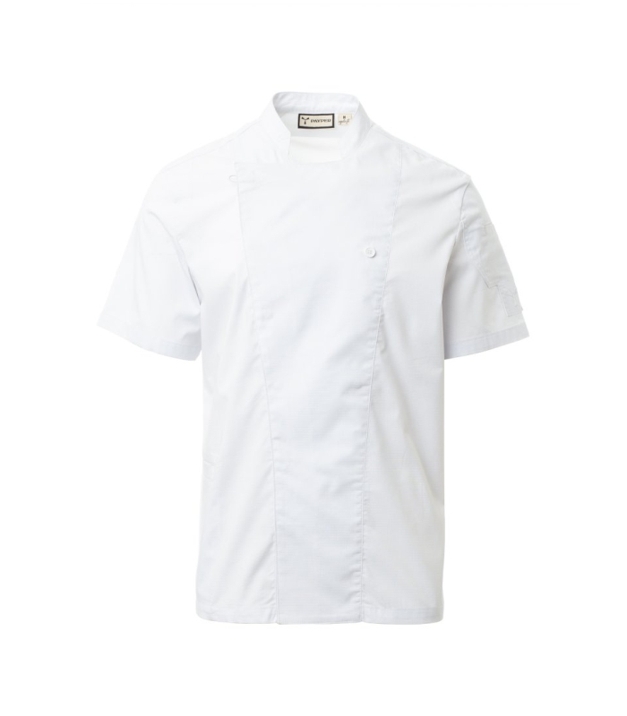 Kuharska jakna s korejskim ovratnikom, izrađena od nepoderivog pamučnog materijala i materijala Lycra® T400®, s izvrsnim elastičnim i prozračnim svojstvima i s udobnom mrežastom tkaninom na leđima i oko otvora za ruke kako bi se povećala prozračnost. Dvostruko kopčanje gumbima, preklopom i pričvršćivanjem na prsima pomoću vidljivog kopčanja gumbima, što stvara efekt krojačkog revera i inovativnog V-izreza. Kratki rukav s porubom. Zakrpa u obliku ikone na lijevom ramenu, s izvezenim spiralama u nijansi, opremljena džepom za olovke. Praktičan džep za pametni telefon u struku.