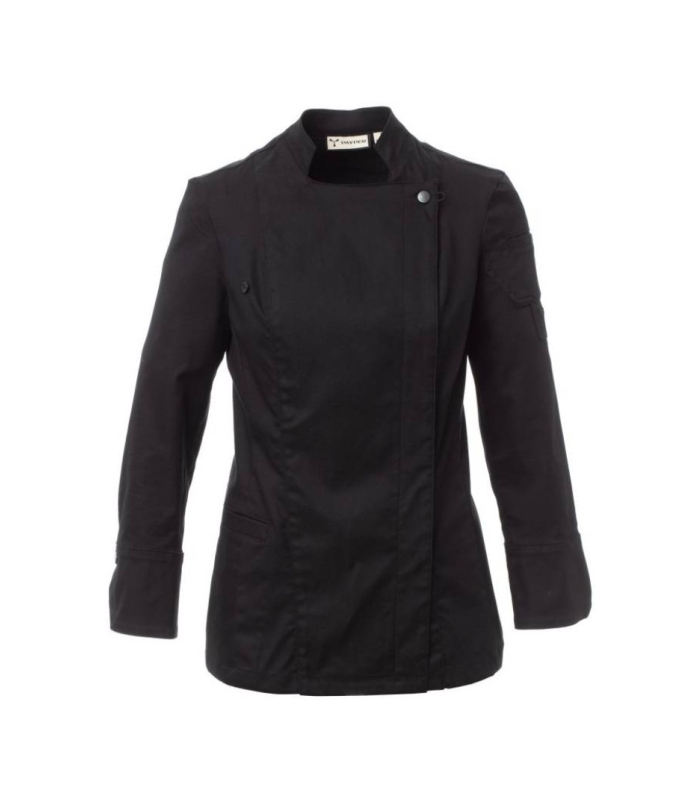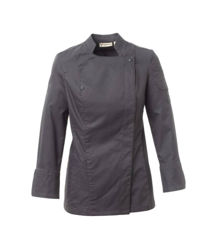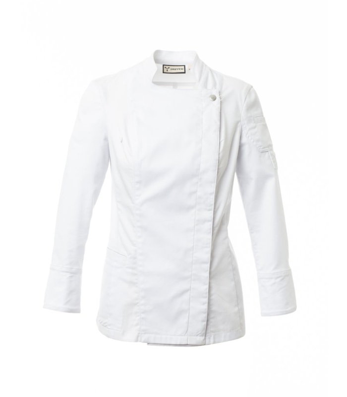 Kuharska jakna s korejskim ovratnikom, izrađena od pamučnog pletenog materijala i materijala Lycra® T400®, s izvrsnim elastičnim i prozračnim svojstvima. Dvostruko kopčanje gumbima, preklopom i pričvršćivanjem na prsima pomoću vidljivog kopčanja gumbima, što stvara efekt krojačkog revera i inovativnog V-izreza. Dugi rukav s manžetom koja se zatvara pritiskom na gumb. Zakrpa u obliku ikone na lijevom ramenu, s izvezenim spiralama u nijansi, opremljena džepom za olovke. Praktičan džep za pametni telefon u struku. Okomiti prorezi na dnu kako bi se olakšalo pomicanje.