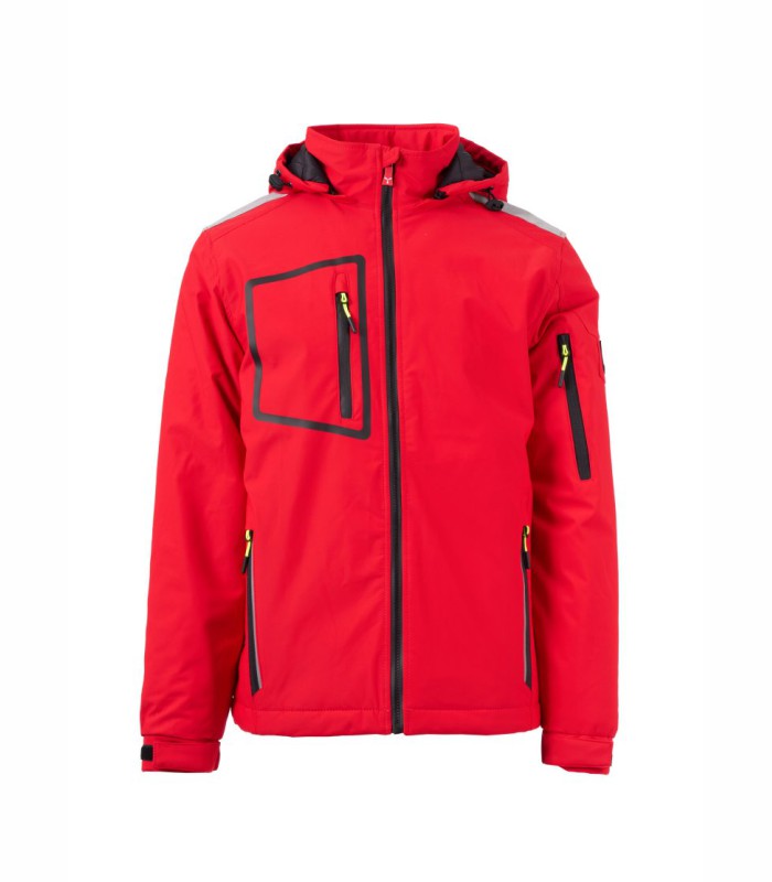 WP 8000 mm H₂O, WVT 5000 g/m² 24 h. Troslojna jakna od materijala Soft-shell, sa srednjom podstavom (140 g/m²), za muškarce, zatvaranje patentnim zatvaračem SBS s metalnim klizačem sa značajkom poluautomatskog zatvaranja i personaliziranim izvlakačem. Odvojiva kapuljača s prilagodljivom uzicom za stezanje. Retroreflektirajuće trake na ramenima, leđima i stražnjoj strani kapuljače. Rastezljive elastične uzice na zapešćima koje se mogu prilagoditi trakom i unutarnji rukav. Toplinski zatvoren džep na prsima koji se zatvara presvučenim patentnim zatvaračem. Dva bočna džepa koja se zatvaraju patentnim zatvaračem s retroreflektirajućim detaljima. Jedan džep na lijevoj ruci s ušivenim držačem za olovke, sa zatvaranjem pomoću patentnog zatvarača. Fluorescentni izvlakači. Dva unutarnja džepa, od kojih je jedan oblikovan patentnim zatvaračem na prsima s desne strane i držač za tabletni uređaj na lijevoj strani koji se zatvara trakom. Prilagodljivo dno s personaliziranim graničnicima.