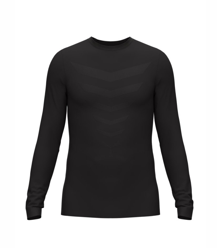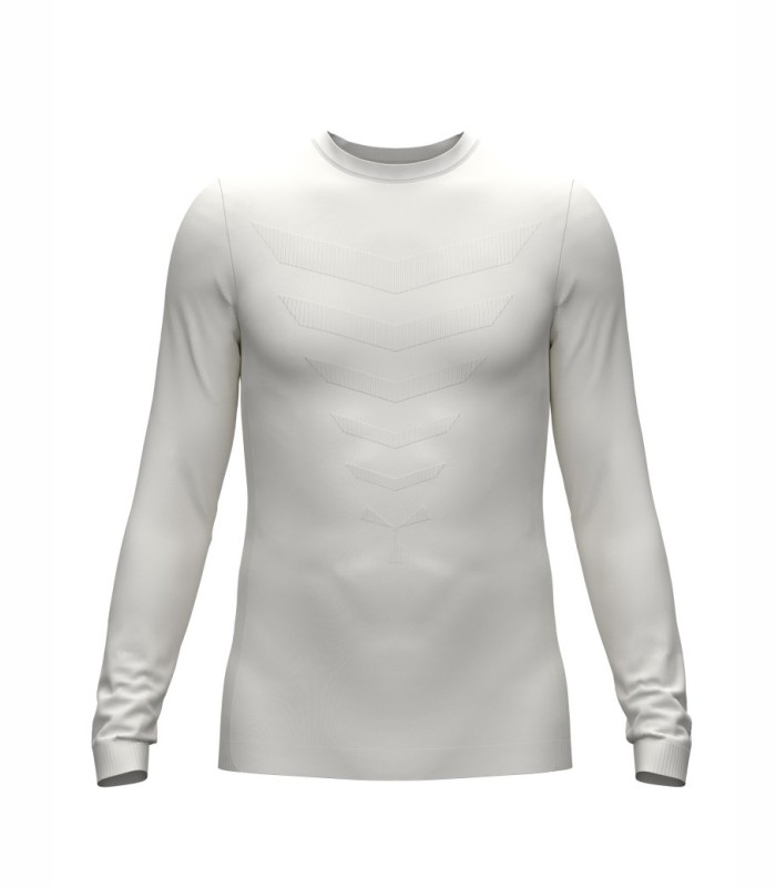 Tehnička košulja s dugim rukavima i okruglim izrezom pojačanih rubova, od prozračne i rastezljive tkanine. Cjevasta struktura, s uskim krojem. Izbočeni dijelovi na prsima, bokovima i leđima. Spiralni motiv na prednjoj strani.