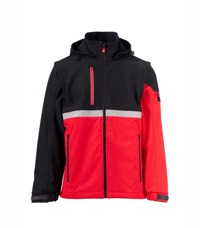 WP 8000 mm H₂O, WVT 5000 g/m² 24 h. Troslojna dvobojna jakna 2-u-1 od materijala Soft-shell za muškarce s odvojivim rukavima. Zatvaranje patentnim zatvaračem SBS s metalnim klizačem sa značajkom poluautomatskog zatvaranja i personaliziranim izvlakačem. Odvojiva kapuljača s prilagodljivom uzicom za stezanje. Prednja retroreflektirajuća traka na prsima. Rastezljive elastične uzice na zapešćima koje se mogu prilagoditi trakom. Dva bočna džepa s patentnim zatvaračem i jedan džep na prsima zatvoren patentnim zatvaračem s retroreflektirajućim detaljem. Element „Life-saving” na leđima, s logotipom od retroreflektirajućeg materijala, zatvara se patentnim zatvaračem. Unutarnji džep za tabletni uređaj koji se zatvara trakom. Prozračna unutarnja podstava na leđima. Prilagodljivo dno s personaliziranim graničnicima.